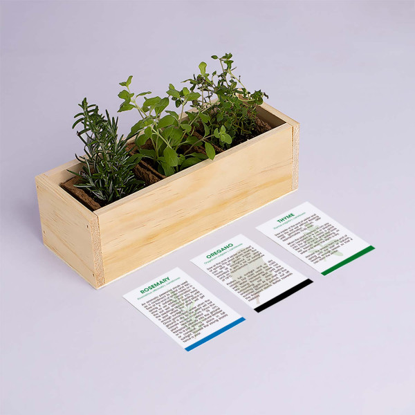 The Provençal Kit contains everything you need to cultivate rosemary, oregano, and thyme: 3 100% biodegradable germination pots, 3 peat pills, 3 seed bombs wrapped in tissue paper, and 3 cards with the necessary care instructions for each plant.