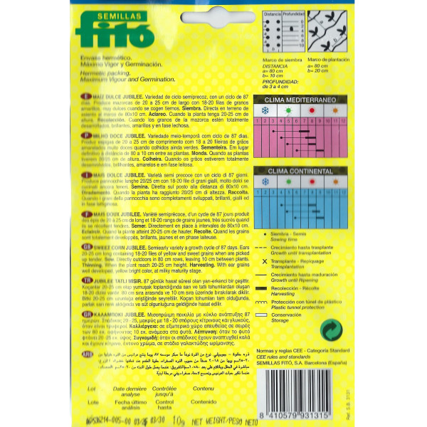 Cultiva tu propio Maíz Dulce Jubilee con estas semillas de alta calidad. Una variedad semiprecoz muy apreciada por producir mazorcas grandes y uniformes con granos dulces y jugosos.