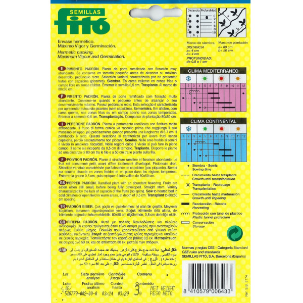 Cultiva pimientos de Padrón clásicos con estas semillas de alta calidad. Una planta ramificada y productiva, conocida por sus frutos que se consumen cuando aún son pequeños, muy popular en aperitivos y en la cocina mediterránea.